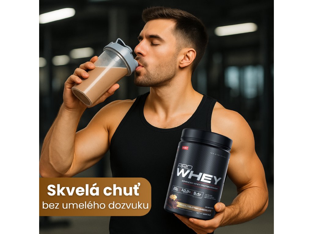 Protein Pro Whey s príchuťou Peanut Butter Chocolate spája srvátkový koncentrát a izolát pre rýchlu vstrebateľnosť, efektívnu regeneráciu a podporu rastu svalovej hmoty. Každá porcia (32 g) obsahuje 25 g bielkovín, minimálne množstvo cukru a tuku, bez zbytočných prísad. Lahodná kombinácia arašidového masla a čokolády robí z tohto proteínu skvelý doplnok do šejkov, raňajkovej kaše či zdravých receptov.